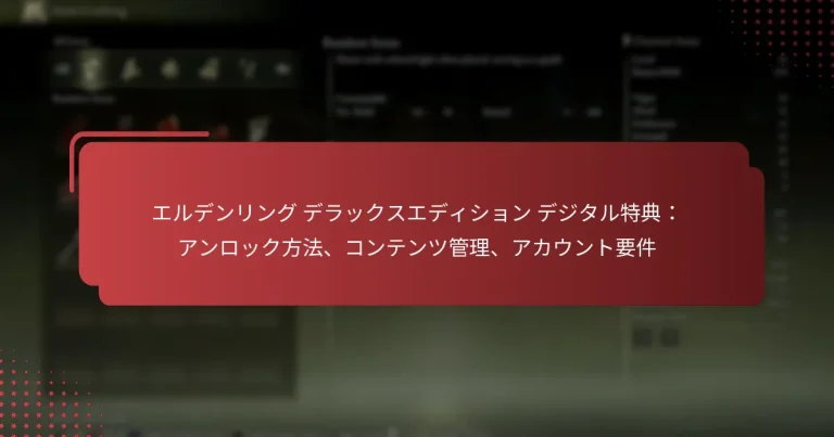 エルデンリング デラックスエディションは、リデンプションコードやプラットフォーム固有のプロセスを含むさまざまな方法でアンロックできるデジタル特典を提供します。これらの特典をダウンロードし整理するためには、適切なコンテンツ管理が不可欠であり、全体的なゲーム体験を向上させます。さらに、プレイヤーは、これらのデジタルボーナスに効果的にアクセスするために、ゲームプラットフォームに基づいた特定のアカウント要件を満たす必要があります。 Key sections in the article: Toggle エルデンリング デラックスエディションのデジタル特典をアンロックする方法は? コードをリデンプションするためのステップバイステップガイド コードリデンプションのための一般的なトラブルシューティングのヒント プラットフォーム固有のアンロックプロセス コンテンツをアンロックするためのタイミングの考慮事項 物理コードとデジタルコードのリデンプションの違い エルデンリング デラックスエディションのコンテンツを管理する方法は? デジタル特典のダウンロードとインストール ゲームプラットフォーム内でのコンテンツの整理 購入したコンテンツの再ダウンロード デジタル特典のストレージ管理 購入とコンテンツ所有の追跡 エルデンリング デラックスエディションの特典にアクセスするためのアカウント要件は? 異なるプラットフォームに必要なゲームアカウント アクセスに必要なサブスクリプションサービス 年齢制限とコンテンツアクセス デジタル特典の地域別の可用性 クロスプラットフォームアクセスのためのアカウントリンク エルデンリング デラックスエディションのデジタル特典をサポートするプラットフォームは? プラットフォーム間のコンテンツ可用性の比較 さまざまなコンソールでのパフォーマンスの違い エルデンリング デラックスエディションのデジタル特典をアンロックする方法は? ....